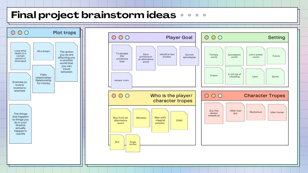 Your final project brainstorming ideas are very well-organized and I like you ideas. These ideas are well-organized so that creator could make up an interactive story in order, and I think that put a story in order is important as if creators don’t to do so it could make a story do not make any sense and players could be very confusing about the story. As a result of this, creators could make a story structure and plot more clear and everyone could refer to this method to create a story.