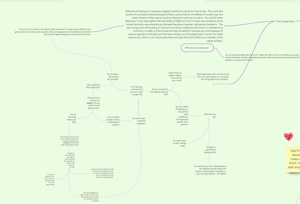 The Miro web is my progress after the first day of brainstorming. I’ve developed the story to follow the trope that a protagonist reveals a secret (accidentally) that shatters their reality. I also want to work in the trope about the anti-hero being called to save the world, but I’ve given the player of the game the autonomy to decide on what kind of protagonist they’ll be – there’s clearly a character choice between the choices I’ve given.