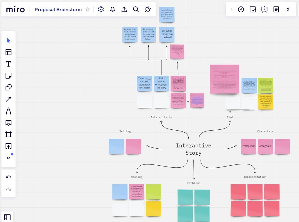 I finally committed to one storyline out of the few I came up with as you can see on my Miro. I struggled on choosing between two very different ideas but decided to go with the one that had a more significant meaning and purpose.