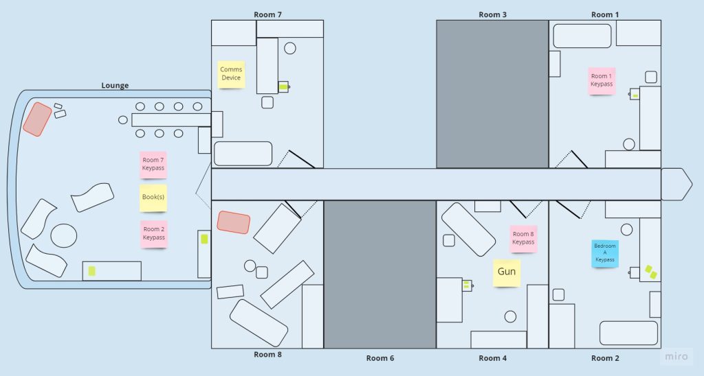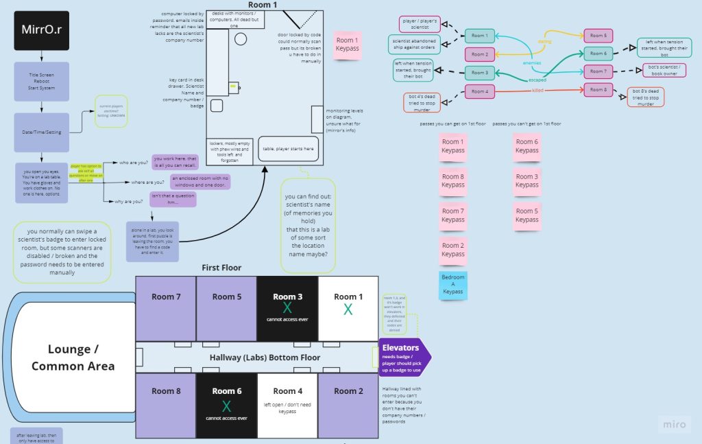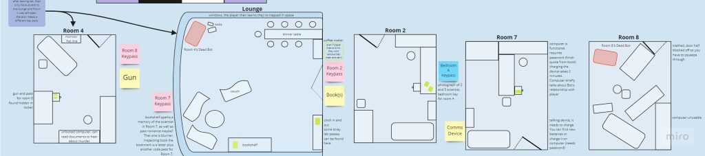 Before I can actually write the game I need to plan what is where and how the player will interact with the rooms in what sequence. It is easier to zoom into with Miro.
