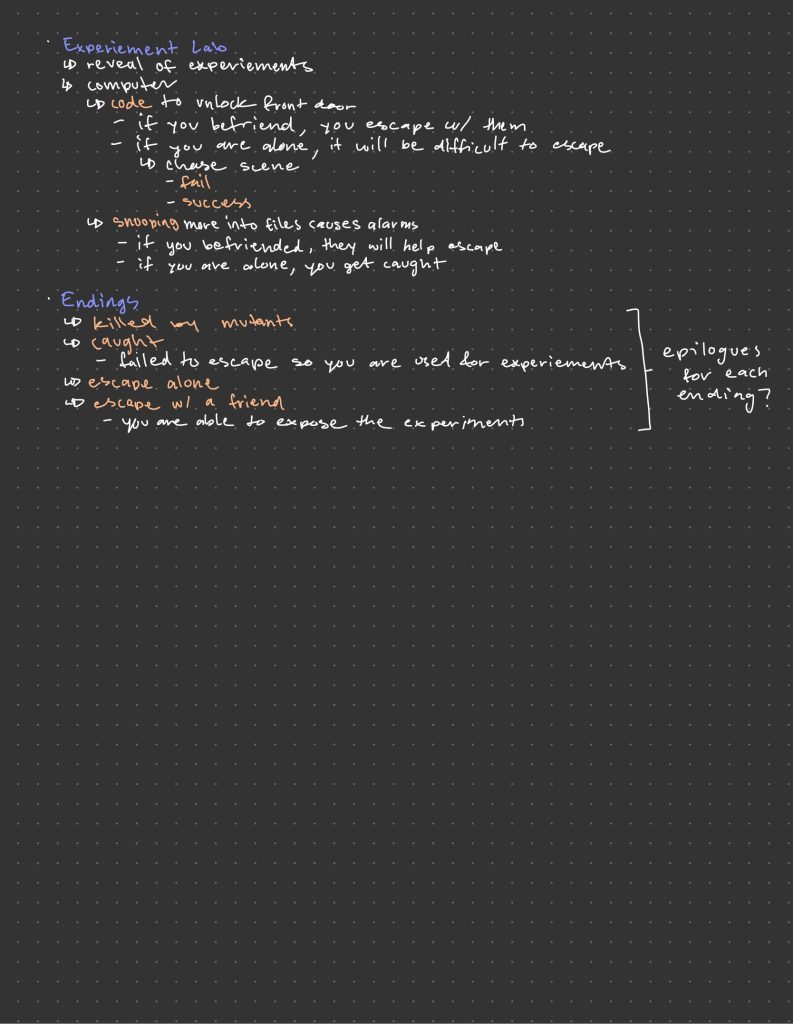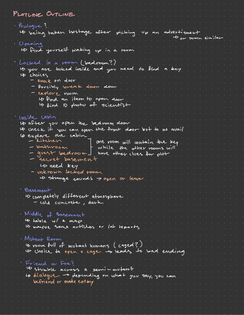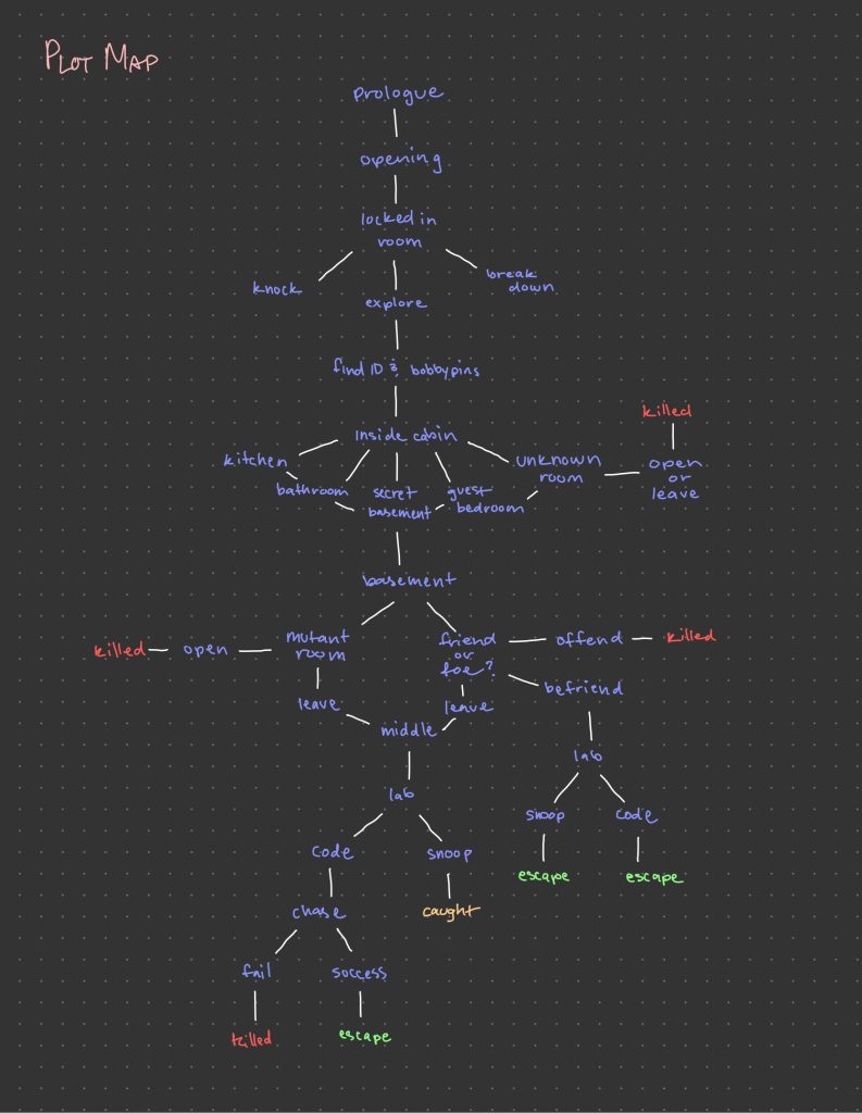 Continuing with my story plans, the notes below are the details of my story and I included what each part would entail. There are some parts where I’m still on the fence about however, I will most likely included them. The plans are not concrete and will need tweaking as I work through my story. I also created a map of how my story will branch just to be organized and is easier for me to see how my story will play out.