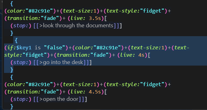 I’m stuck on getting the keys to work. I have it set so if the player already has the key, the option to go into the room they picked it up doesn’t show, but it keeps showing up regardless? I think I am just using the if: variables wrong or am putting them in the wrong order. I don’t understand why it isn’t working though.