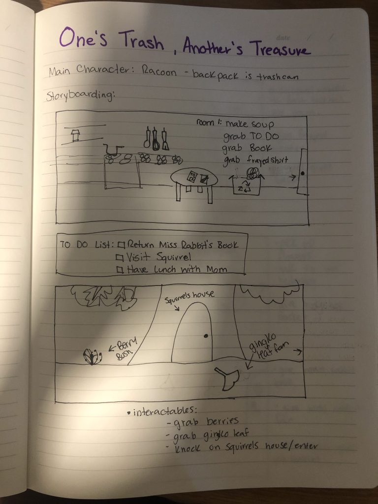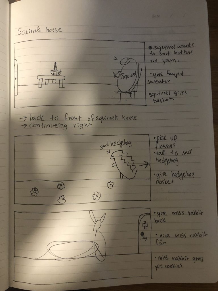 Here is some storyboarding I did for my game along with the working title. I decided to go with a simple linear storyline to give it more of a children’s book feeling. I want it to be a game someone could easily play with a child. My drawing is not that great but luckily that won’t really be a problem with the art style I am going to use.
