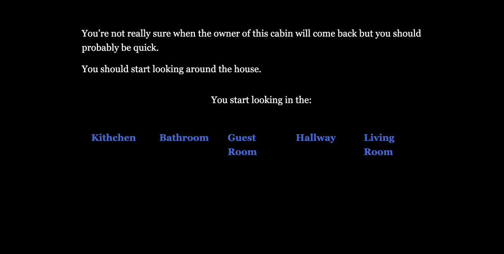 I was still on edge about using Twine from my previous post, but now I’m fully committing to the platform. I finally finished writing out my story a few days ago and started implementing it into Twine. So far, it’s not so bad to use as I literally have to copy and paste my story into the platform, but it is a bit tedious. I didn’t plan to make my story very complex so I’m sticking with the simplest code that anyone can implement themselves.