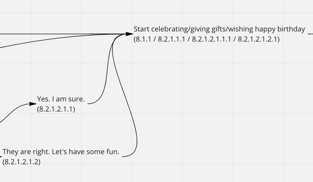 Originally, I was deciding between making a PowerPoint or YouTube video for this project but I found planning became very hard to do when I was using a Miro board to plan, Google Doc for a script, and then a PowerPoint to put it all together. It was hard to keep track of my paths and it was all getting really messy. For example, the photo attached below. There were so many paths leading to one scenario, and my numbering system was getting more than complicated to keep track of.