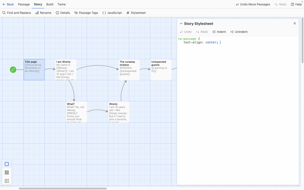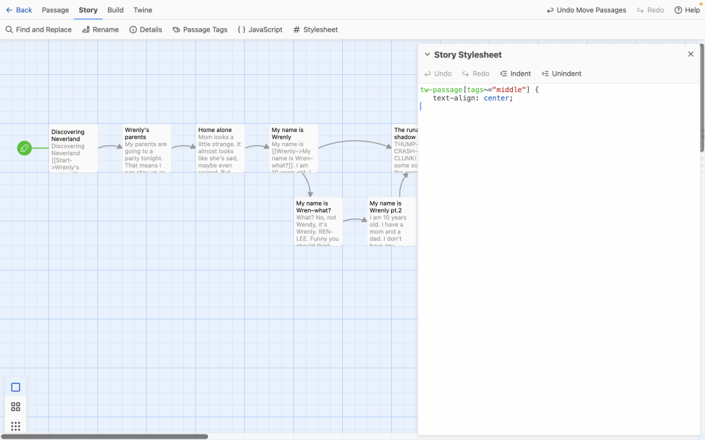 This worked, but I didn’t want to center everything in my story, I wanted most passages to be on the left side.