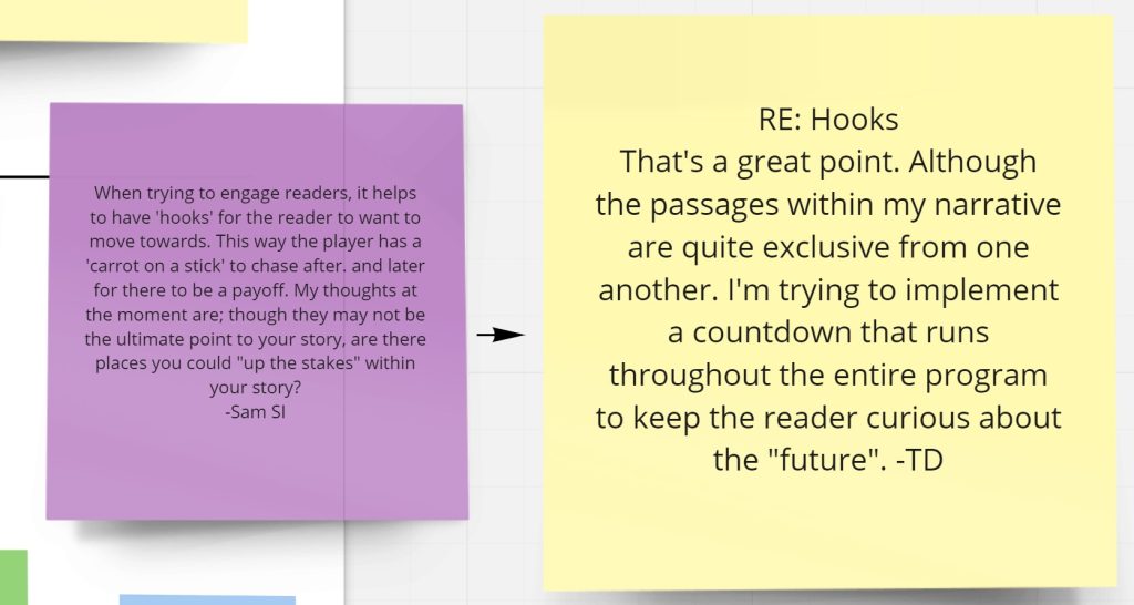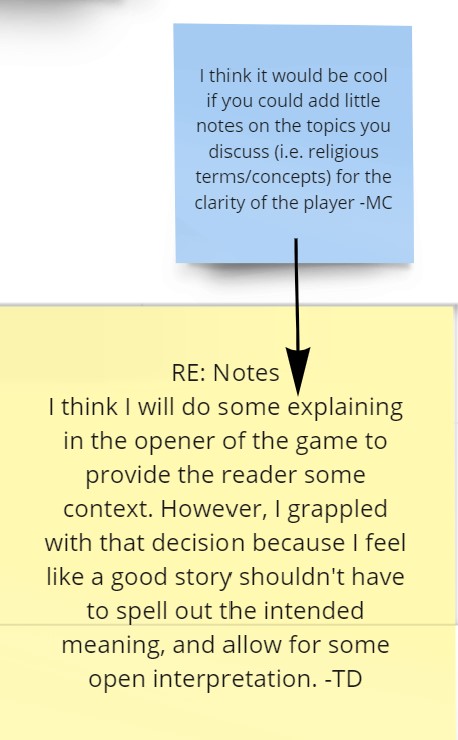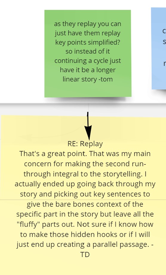 I wanted to thank everyone for all of their kind and thoughtful comments about my interactive story concept. It was difficult to verbalize all of my thoughts because I think I could go on forever about features I wanted to include and the symbolism behind them but it was a good exercise to clarify and refine my ideas.