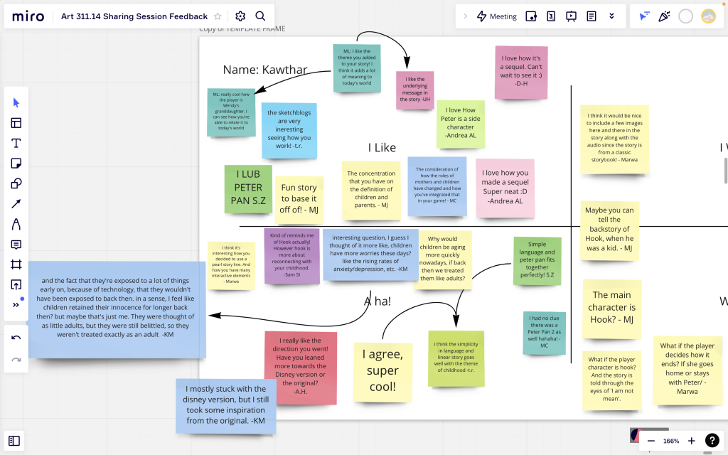I really wanted to thank every for giving me feedback and sharing their thoughts when I presented my game yesterday! There were some questions on the Miro board that I answered, but I wasn’t sure if anyone went back to see them, so here’s an image: