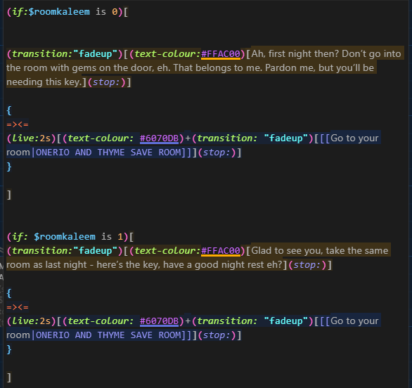 Essentially here- $roomkaleem is a variable that tells the code whether you have asked Kaleem for a room prior to talking with her. If $roomkaleem is 0, it means this is the first time you are talking to her, and will display something like this: